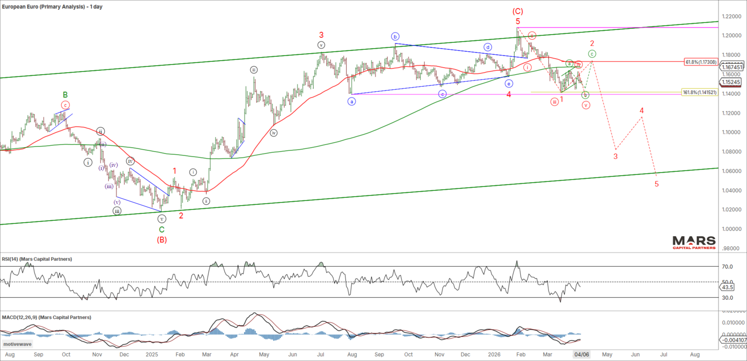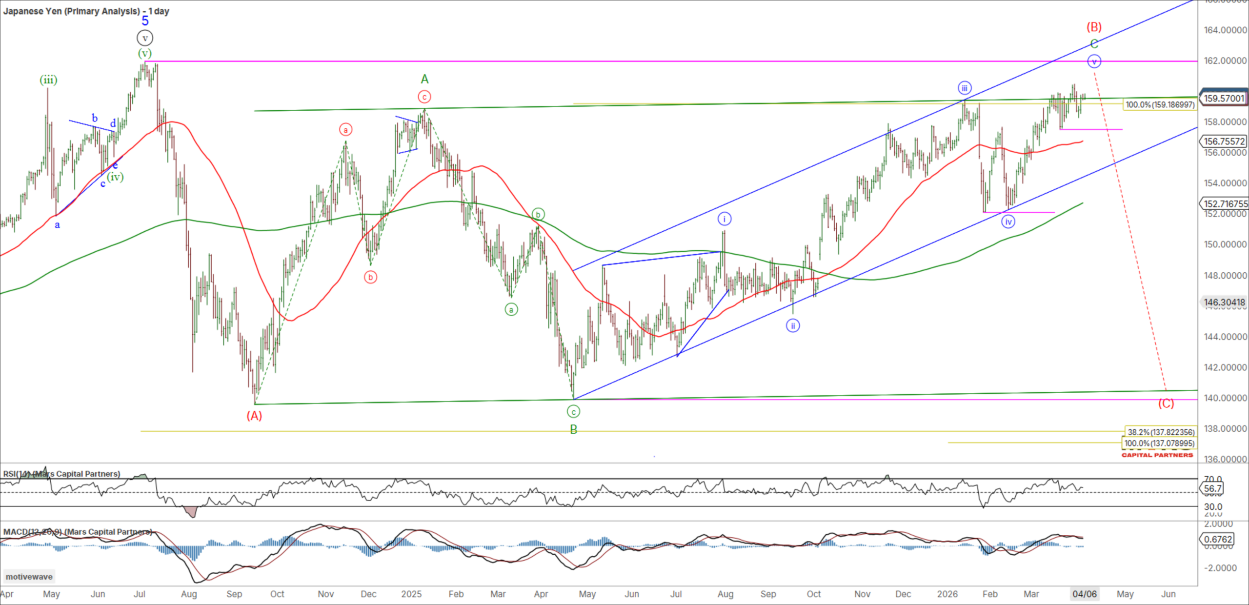 The USDJPY pushed marginally higher last week but remains below key resistance in the 162 area. We do not have confirmation of a tradable top or bear reversal as bulls and bears fight it out. Bears need to reverse this rally and break this series of higher highs and higher lows to help confirm a bearish change in trend. We remain bearish against the 162 highs as we look for a large red wave (C) decline towards measured targets in the 138-140 area. Trade above 162 invalidates the bear case.
